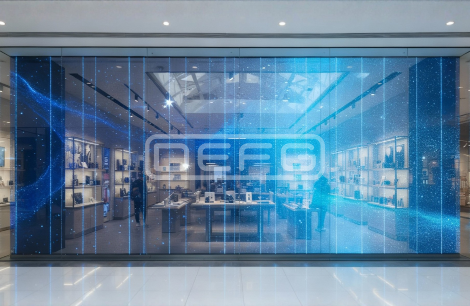- จอ LED ฟิล์มใส (LED Transparent Film Screen) มีค่าความโปร่งใสสูงมาก อยู่ที่ประมาณ 85-95% แม้ในขณะที่จอแสดงผลอยู่ ผู้คนก็ยังสามารถมองเห็นสินค้าที่อยู่ด้านหลังกระจกได้อย่างชัดเจน ทำให้การแสดงโฆษณาไม่บดบังสินค้าจริง เหมาะสำหรับหน้าร้านค้าและโชว์รูมที่ต้องการดึงดูดความสนใจจากลูกค้า